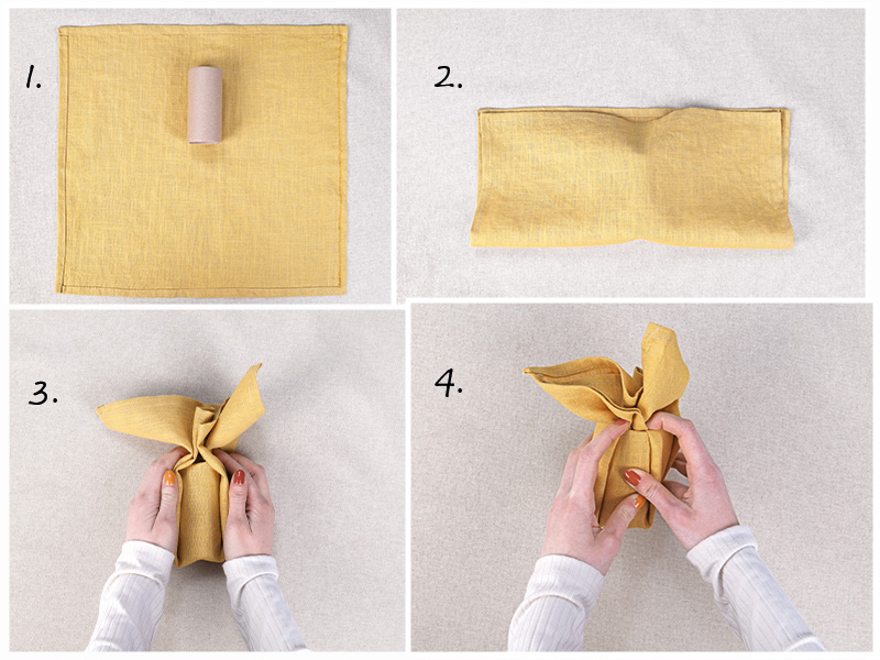 Lägg den färdiga servetten platt på bordet. Placera en tom toarulle strax ovanför servettens mitt och vik upp den nedre delen över rullen. Samla sedan ihop tyget från sidorna och tryck försiktigt ner det i rullens öppning. Det kan kräva lite pillande, men fortsätt tills två av servettens hörn sticker upp – de blir harens öron.