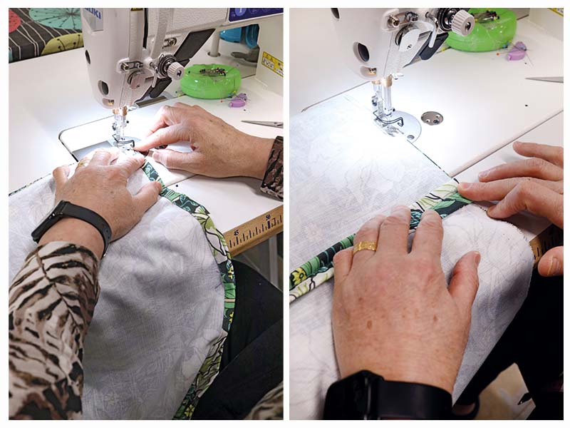 5. Vik in hörnen på botten så att sidorna möts i en spets. Sy rakt över för att skapa en botten på väskan.