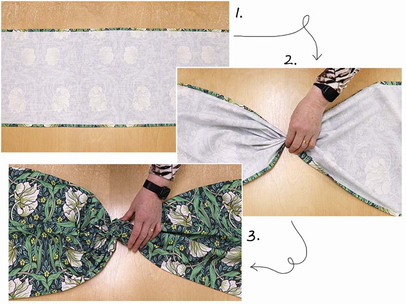 3. När tygstycket är fållat placerar du det på en plan yta och knyter en knut på mitten av tyget. Här kan du behöva dra efter och fixa knuten så att det ser snyggt ut.